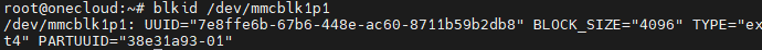 - 接着查看U盘的UUID,输入blkid 硬盘名称,所以我这里的命令就是blkid /dev/mmcblk1p1,把UUID=”xxx”复制出来,一会要用。我的为