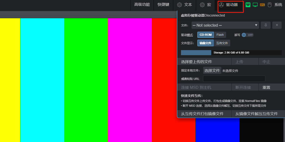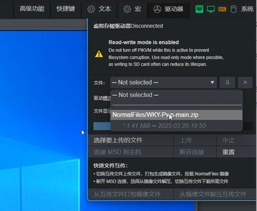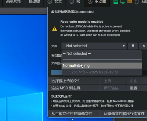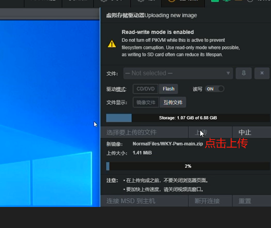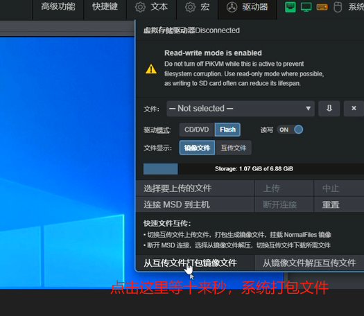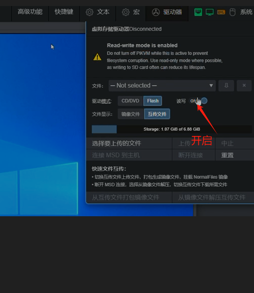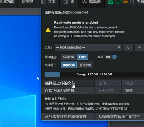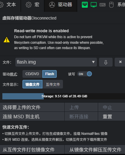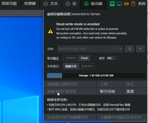 3、flash.img权限赋予权限后进入网页端,驱动模式选择Flash模式,读写勾选ON,然后选择flash.img这个文件,选择连接至主机,这时你的电脑会显示一个U盘,将其格式化可用pe工具制作成启动盘,对应的系统ISO镜像可存入PE空间内。