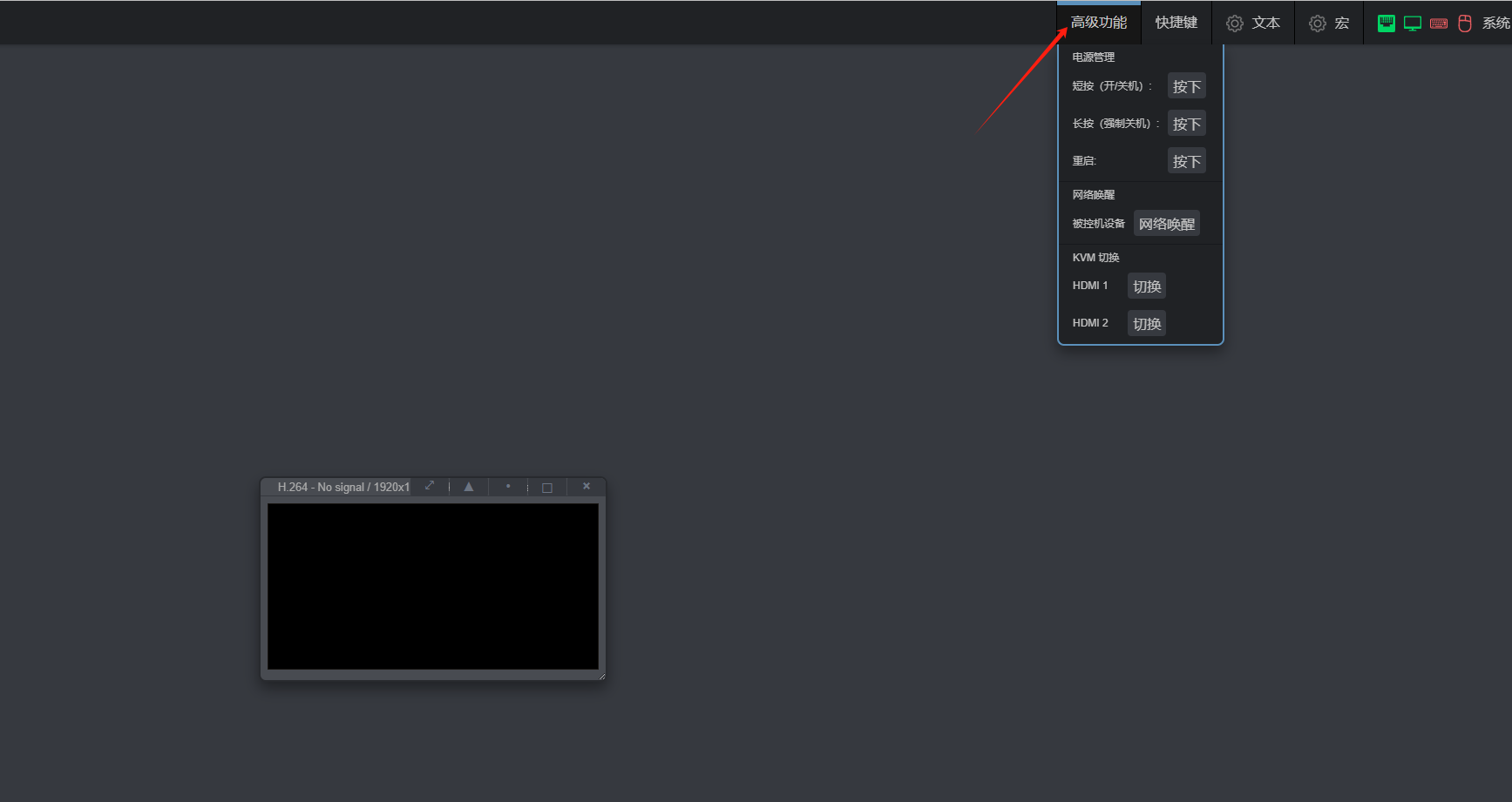 2、高级功能区域对应有开机、关机按钮(鼠标点击一下即可,不用长摁)