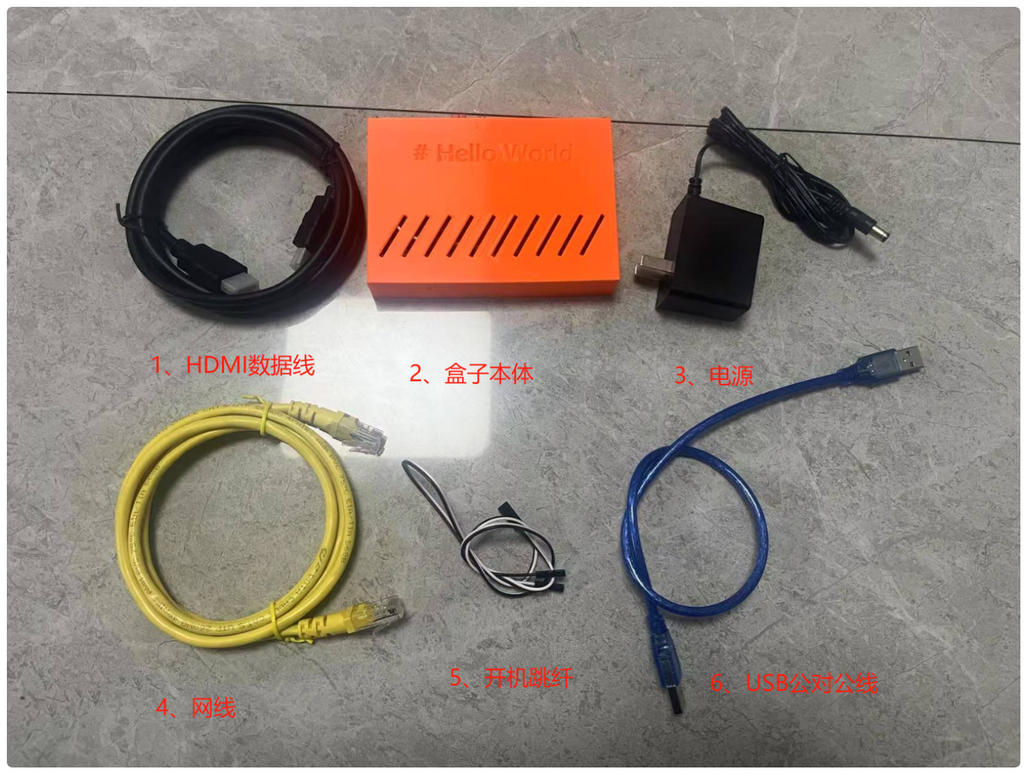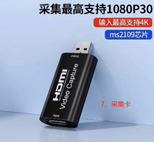1.1购买外置采集卡版本包装内共计8个零部件,如图所示共计6个基础部件再加上一个采集卡一个开机一分二