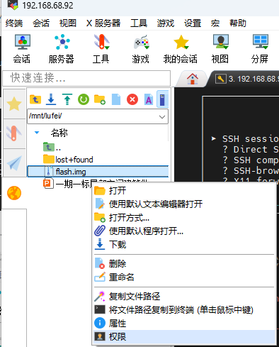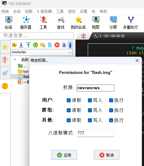 2、生成flash.img文件后,用ssh工具进入/mnt/lufei文件夹中找到这个文件并更改这个文件的权限
