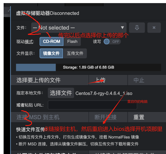 2、本地文件选择上传ISO镜像文件。!!!注意,下方图片中的第3步重启进入bios是重启X86主机不是重启盒子)