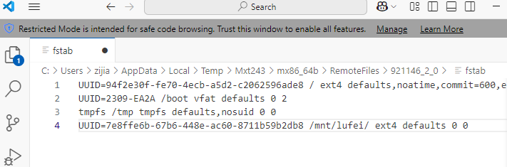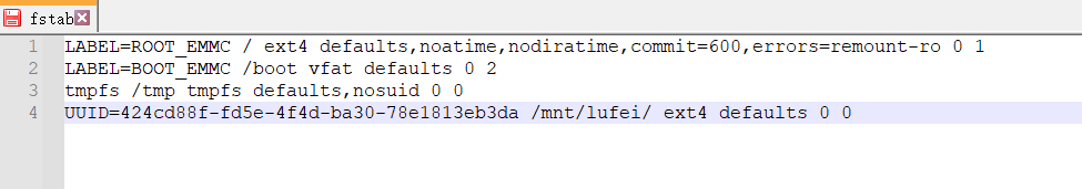 我的为UUID=7e8ffe6b-67b6-448e-ac60-8711b59b2db8 /mnt/lufei/ ext4 defaults 0 0