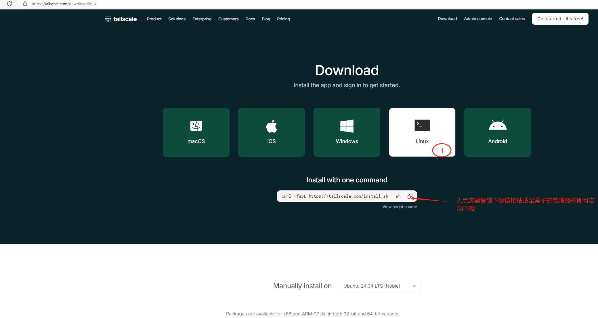 回车进入管理员页面 - 点击这个链接跳转到管网Download | Tailscale回找到linux图标复制下面的一键安装链接